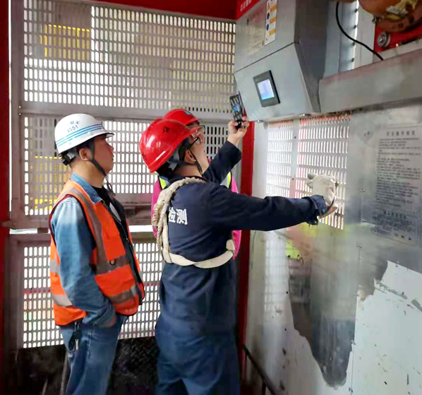 檢測(cè)人員在現(xiàn)場(chǎng)檢測(cè)塔吊和升降機(jī)安全性能
