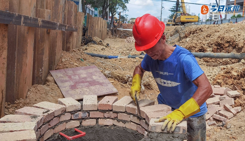 湘永路改造現(xiàn)場(chǎng) 施工人員正在砌檢查井湘永路改造現(xiàn)場(chǎng)