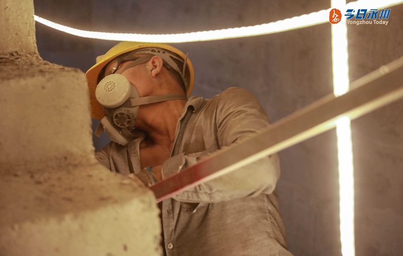 文昌閣安置小區(qū) 施工人員在切割打磨多余的浮漿