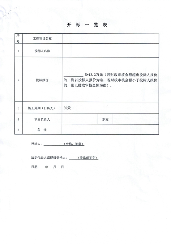 3.6、報(bào)價(jià)提交:開標(biāo)后現(xiàn)場(chǎng)提交密封的報(bào)價(jià)單,報(bào)價(jià)單為折扣數(shù),加蓋公章,當(dāng)場(chǎng)拆封宣布(報(bào)價(jià)單下載附件開標(biāo)一覽表)。
