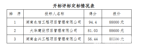 經(jīng)評標(biāo)委員會全體成員采用綜合評分法,中標(biāo)單位為湖南永信工程項(xiàng)目管理有限公司。