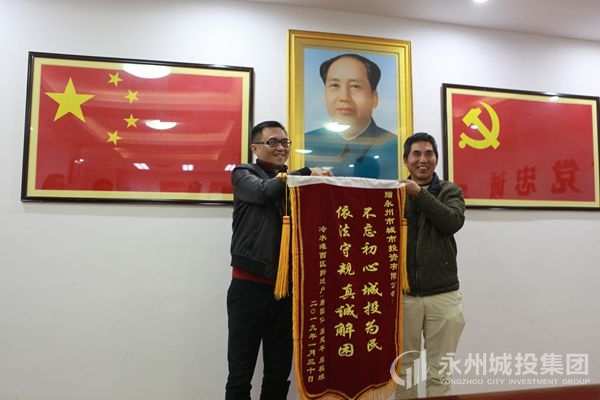 1月31日,原西區(qū)購地戶代表將寫有“不忘初心 城投為民 依法守規(guī) 真誠解困”、“依法守規(guī)嚴把關(guān) 增資保值創(chuàng)輝煌”的錦旗送到集團公司,感謝解決其多年來被收回土地補償問題,市城投集團黨委副書記、總經(jīng)理蔣志剛,總經(jīng)濟師呂博熱情接待了前來送錦旗的補償戶代表。