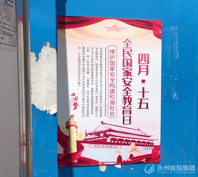 為認(rèn)真貫徹落實(shí)總體國家安全觀,增強(qiáng)全民國家安全意識(shí),根據(jù)市國安辦的要求,市城投集團(tuán)充分利用室外視頻媒介資源,通過公司總部和下屬子公司管理的梅灣路建設(shè)銀行LED電子顯示屏,連日滾動(dòng)播放國家安全觀宣傳教育片、宣傳海報(bào)。同時(shí),組織將軍嶺、文昌閣、逸云路、糧貿(mào)等6個(gè)在建重點(diǎn)項(xiàng)目,在項(xiàng)目工地醒目位置張掛宣傳橫幅、張貼宣傳海報(bào)等多種形式,廣泛宣傳國家安全觀和國家安全相關(guān)法律法規(guī),增強(qiáng)干部職工和廣大市民的國家安全意識(shí),營造自覺履行維護(hù)國家安全責(zé)任義務(wù)的良好氛圍。