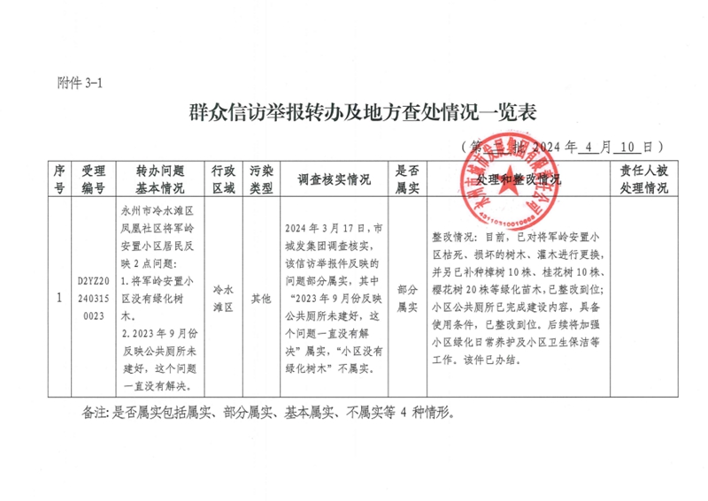 2024年3月16日,我司接到省第四生態(tài)環(huán)境保護督察組轉(zhuǎn)辦的第二批D2YZ202403150023號環(huán)境舉報問題,群眾反映將軍嶺安置小區(qū)沒有綠化樹木、小區(qū)公共廁所未建好等問題,現(xiàn)已辦結(jié),現(xiàn)報告如下: