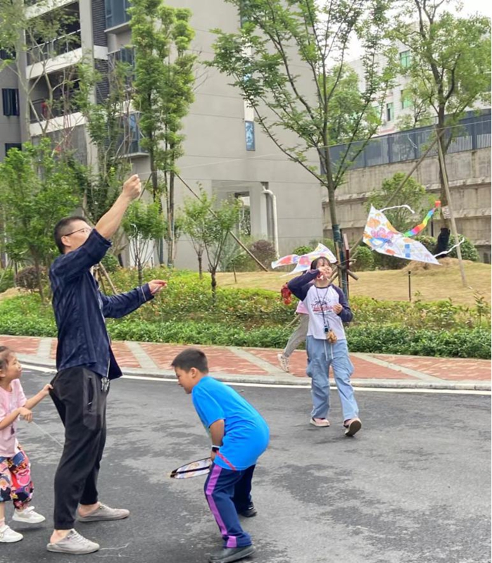 風箏繪畫活動結(jié)束后,小區(qū)兒童及其父母共同在小區(qū)空地上放起了自己的風箏,讓風箏帶著孩子們的夢想飛向高空。