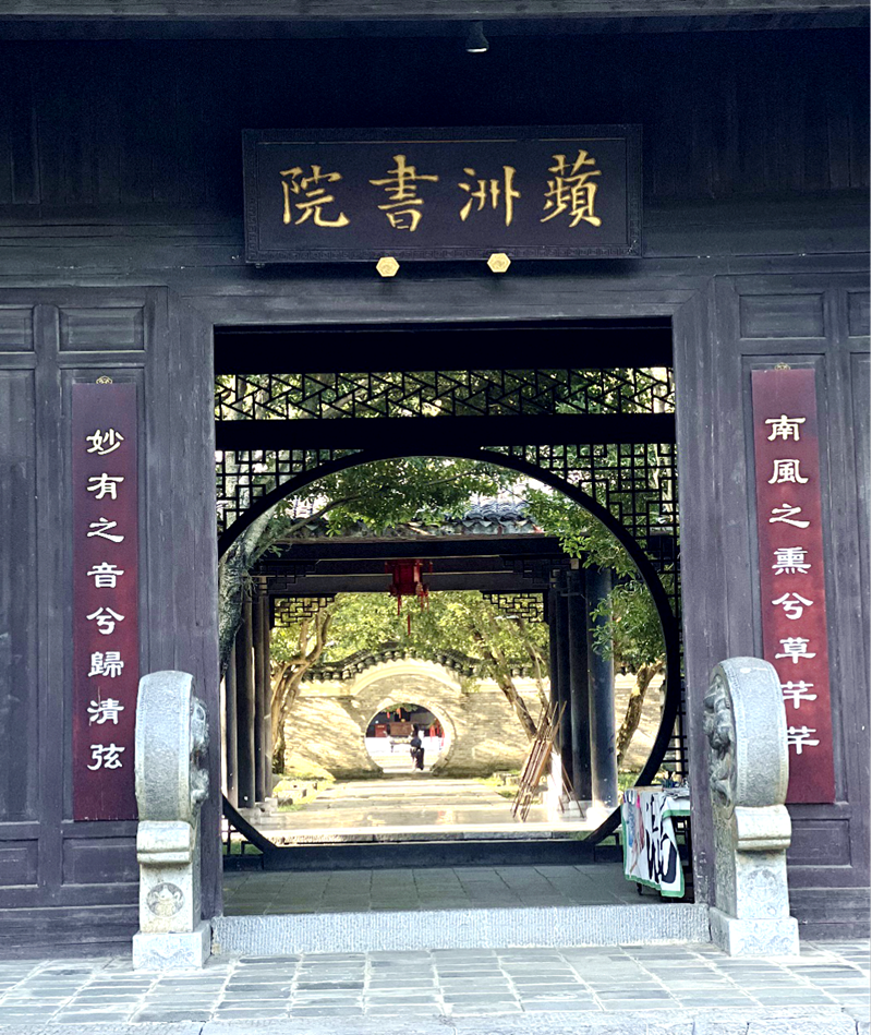 “瀟湘兩派繞萍洲,薄霧微濛古渡頭?!毙〗M全員追尋著古人足跡,乘船渡過瀟水后登島,印入眼簾的是綠樹掩映的拱形門樓,古色古香的欄砌甬道,參天入云的古樹名木,人文薈萃的詩文碑刻……島內遙望樹木連綿成云,近聽鳥語蟲鳴為歌,清風拂面,花香沉醉,動靜互映,天地交融,讓人身臨其境感受到書院古樸典雅的氛圍,振聾發(fā)聵的歷史回音,兼容并蓄的厚重文化。