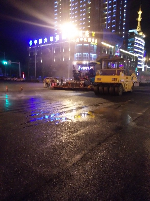 透視燈光看美景,二臺攤鋪機,前后相距10M左右梯形式攤鋪,五臺壓路機各司其職錯落有致來回碾壓,有料車卸料、料車待料、密封好的料車來、剛卸完的料車走,有局部補料和修整的工人,攤鋪過程中有專人指揮車輛卸料,銜接及時,依次有序;有測量工程師及監(jiān)理工程師跟蹤測油面縱斷高程,橫坡及攤鋪厚度,如不符要求及時調整;按初壓、復壓、終壓嚴控瀝青混合料溫度和碾壓機械及施工工藝;關鍵路段、關鍵工藝增加了灑水車快速降溫,盡快開放交通以便利民。一遍忙碌的景象,一股足足干勁,一股非凡的拼勁,干出了美的色彩,拼出了夏夜的激情。附近的人、路過的人、好學的人、好奇的人、老人、年青人,慨嘆聲,慨嘆社會進步之快,銜接如此吻合;評論聲,評論工藝之快,呼啦啦就開放了交通;灑布聲、攤鋪聲、碾壓聲、振動聲、灑水聲、各種車的鳴啼聲、指揮聲、談笑聲湊出這夜色中的五線譜。