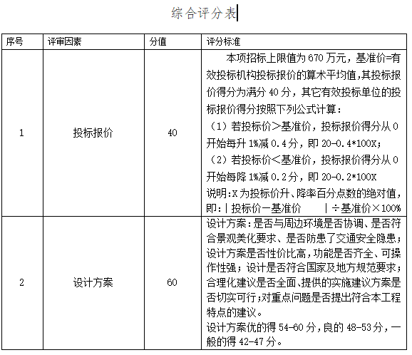 采用綜合評分法。評標委員會對有效投標報價從低至高依次進行評審,推薦1名中標候選人,綜合得分相等的,以設計方案得分高者優(yōu)先。