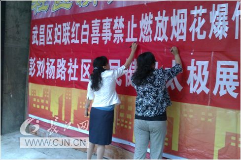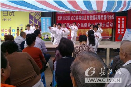 9月6日,武昌區(qū)婦聯(lián)聯(lián)合彭劉楊路社區(qū)舉辦“紅白喜事禁止燃放煙花爆竹”宣傳活動,社區(qū)太極隊也積極助興,現(xiàn)場表演楊式太極37式,陳式太極、太極功夫扇、陳式炮拳、32式太極劍;顒幼詈,所有在場居民在橫幅標語上簽上自己的名字,積極響應(yīng)政府禁鞭規(guī)定。